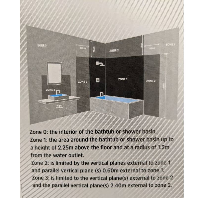 • Zone 1: is the area around the bathtub or shower basin up to a height of 2.25m above the floor and at a radius of 1.2m from the water outlet