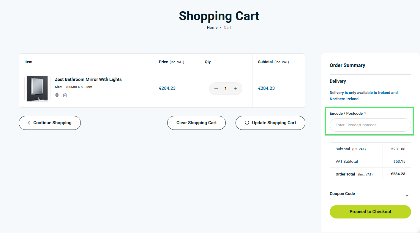You can check any delivery rates easily by adding items to your cart, choosing your location and then entering your Eir Code or Postcode.