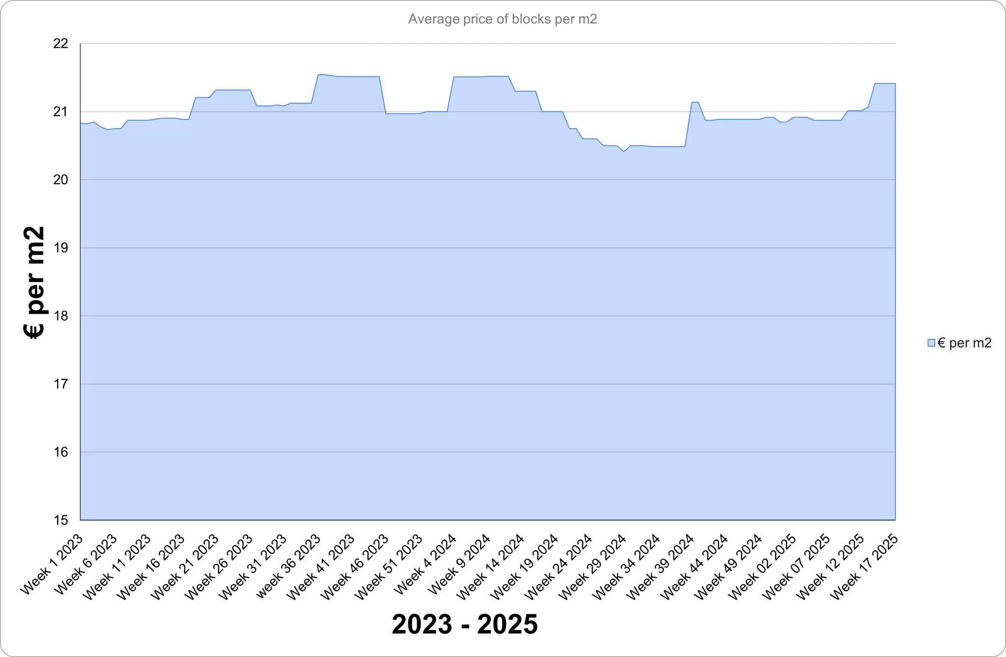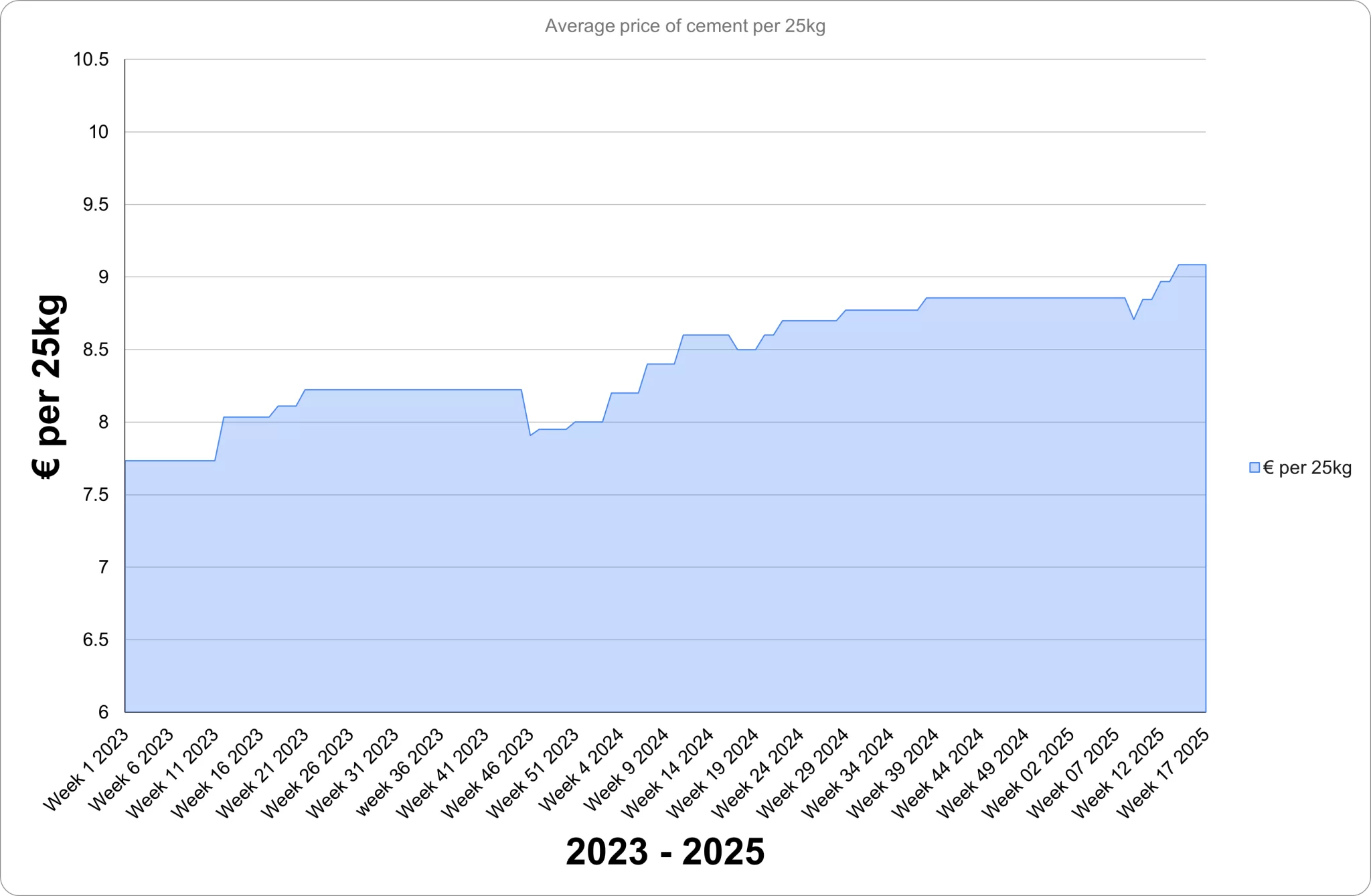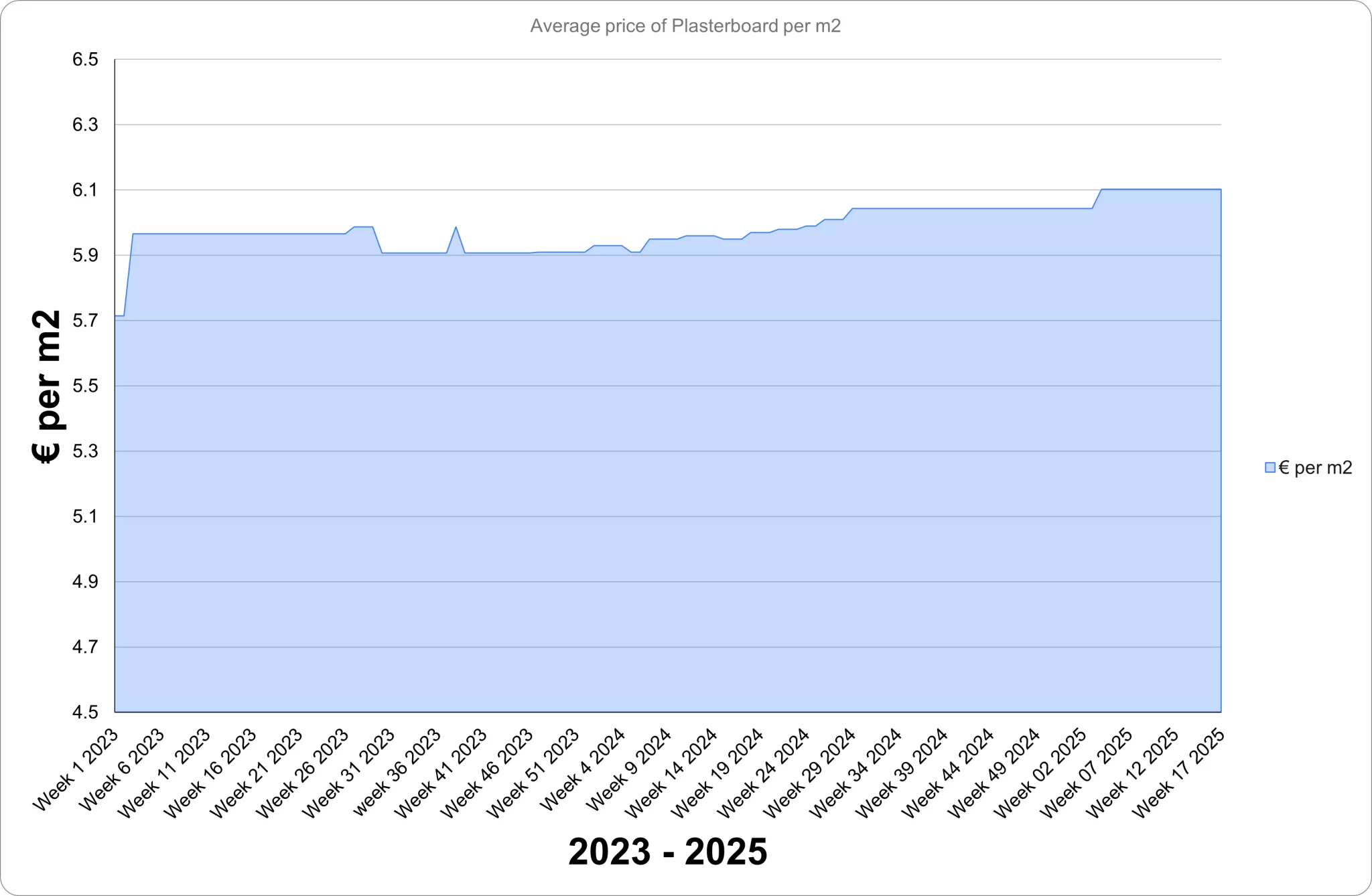 In 2025, prices remained flat at €54.65 through Week 10, dipped slightly in Weeks 11–12, and then rebounded to €55.59 by Week 13. Prices have remained stable at this level since.
