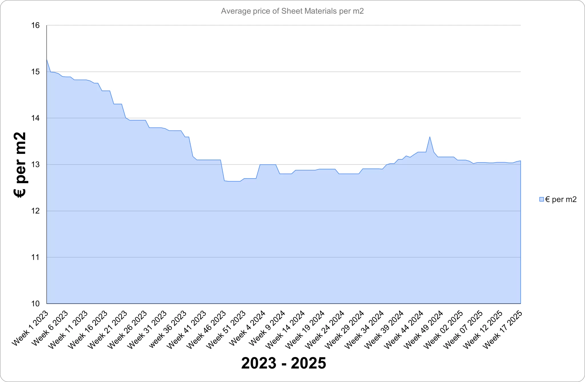 In early 2023, prices were high at approximately €88.99 per sheet in Week 1. A sharp drop occurred by Week 15, bringing prices down to €76.76. This downward trend continued through the summer, with prices reaching €65 by Week 30 and further declining to €61.90 by the end of the year.